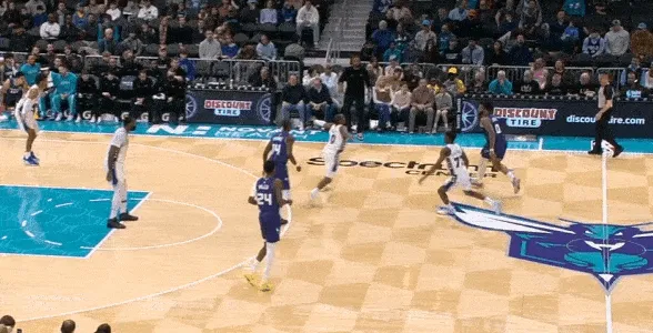 米勒油漆区无球起手执行位置更高的“Spanoulis action”,借三球中路下掩护上提后接手递手,随后立即衔接翻转掩护角度后的边路挡拆发起,炸球上步急停坚决出手持球三分,惩罚庄神的弱延误。