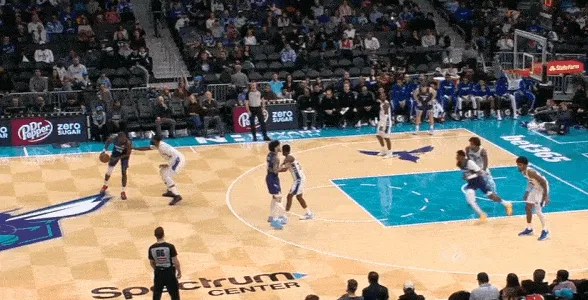 米勒对位上线的马克西因此获得快攻最前线的天然身位优势,随后和快速推进的三球获得前场2打1的优势局面。米勒右路跟进切入篮下,接三球高吊传球直接空接隔扣马克西。